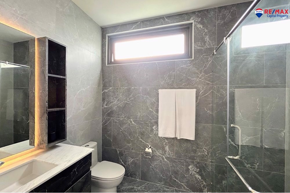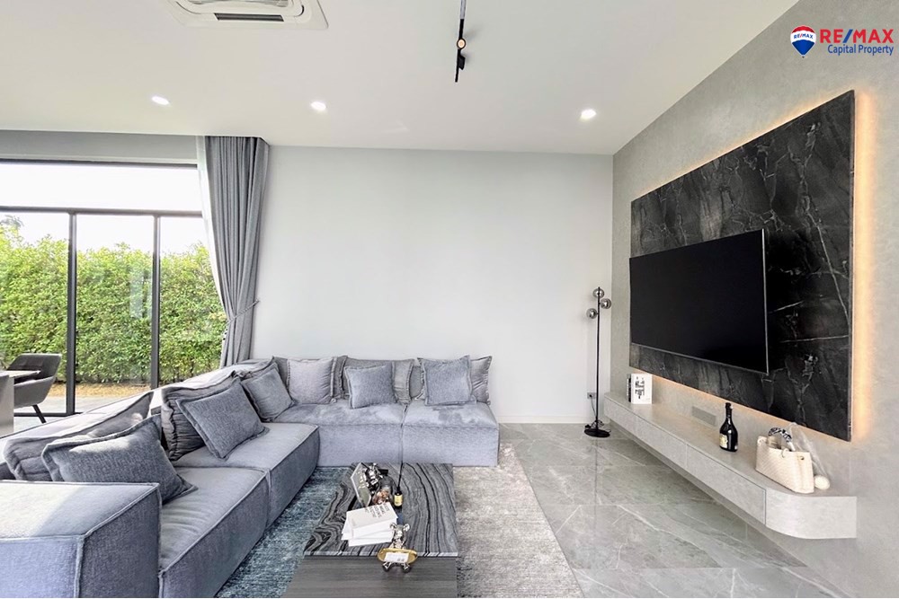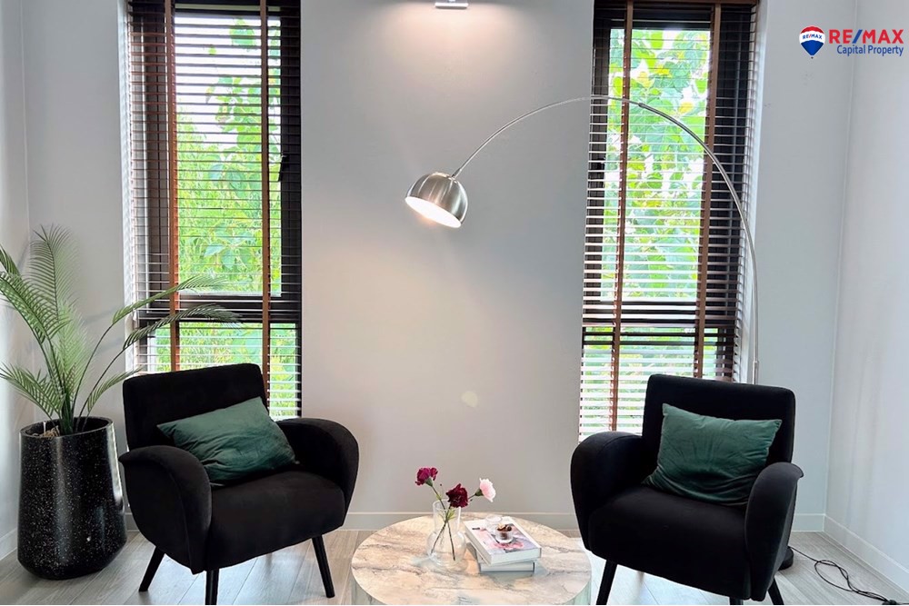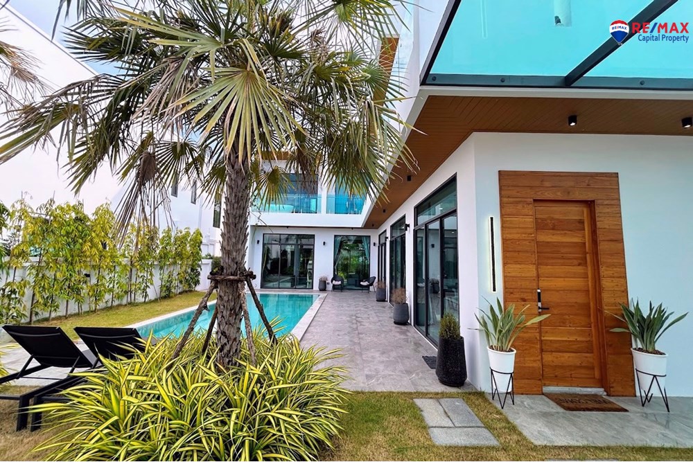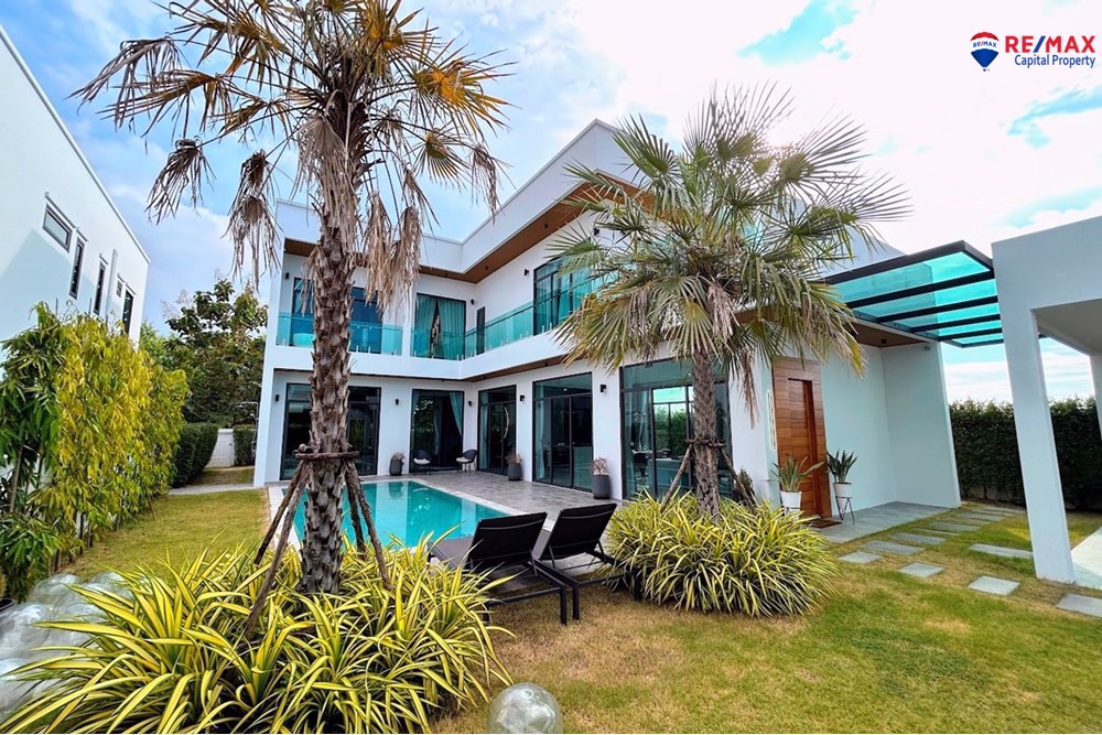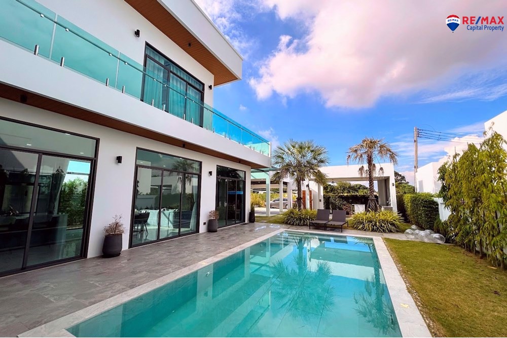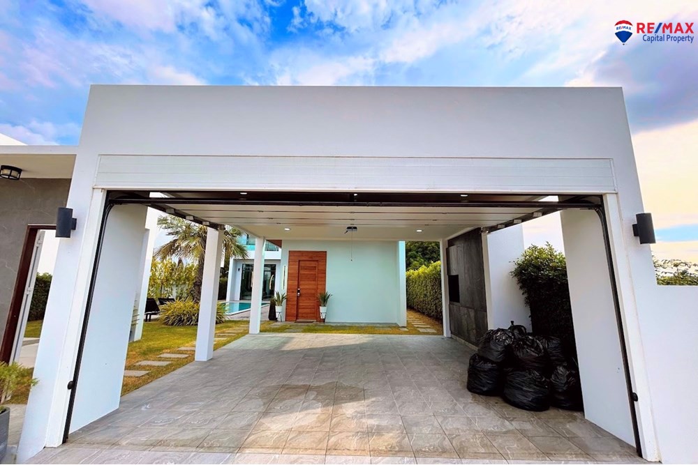 This villa offers a 4x8m private swimming pool with a 30 sqm poolside terrace, 80 sqm landscaped garden, a beautiful pavilion sala with built-in bar, and a covered 2-car garage with storage.