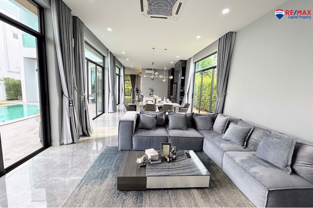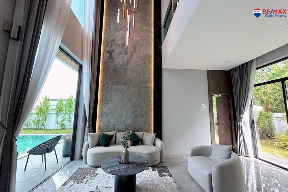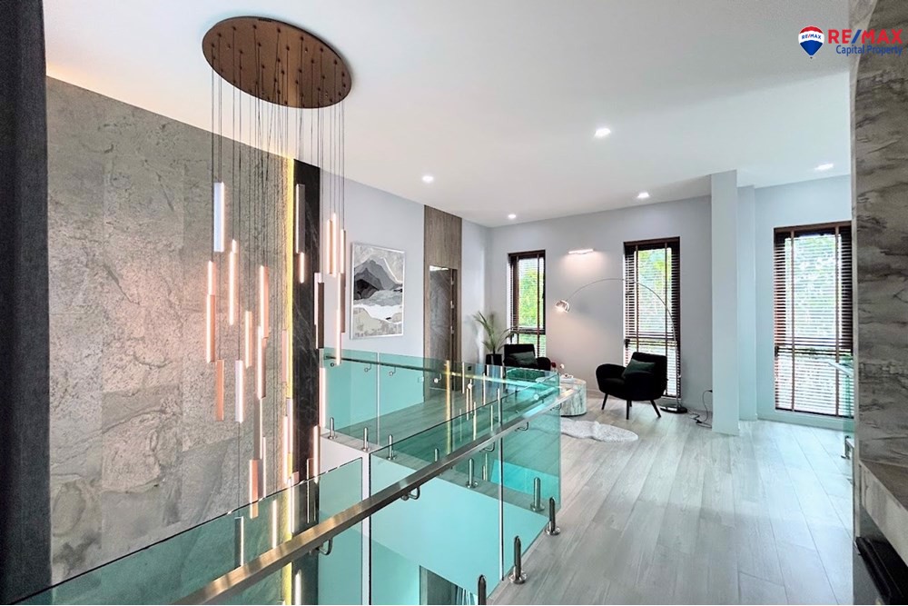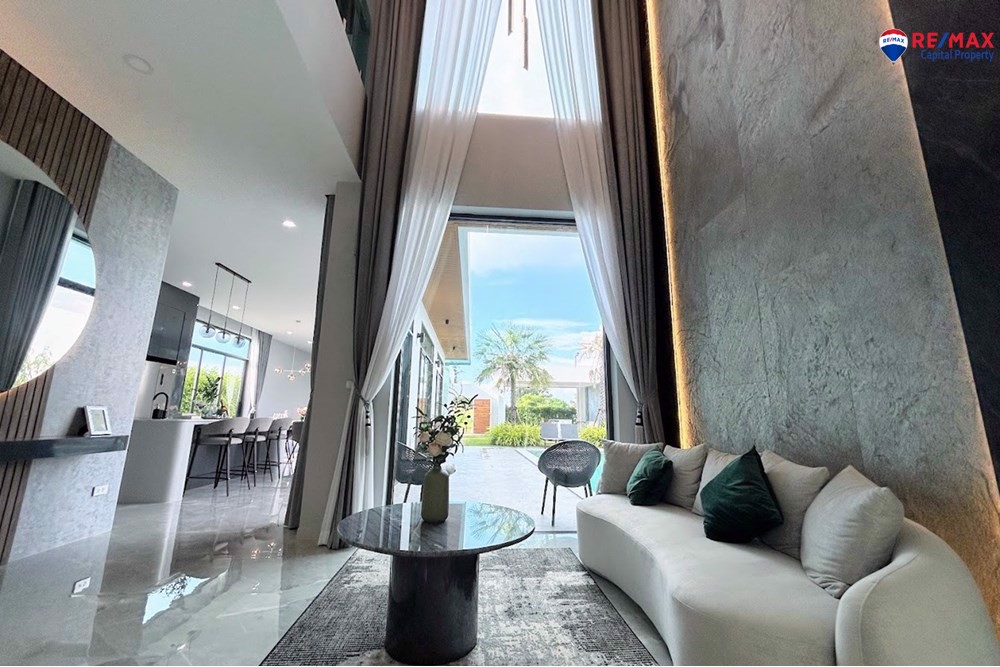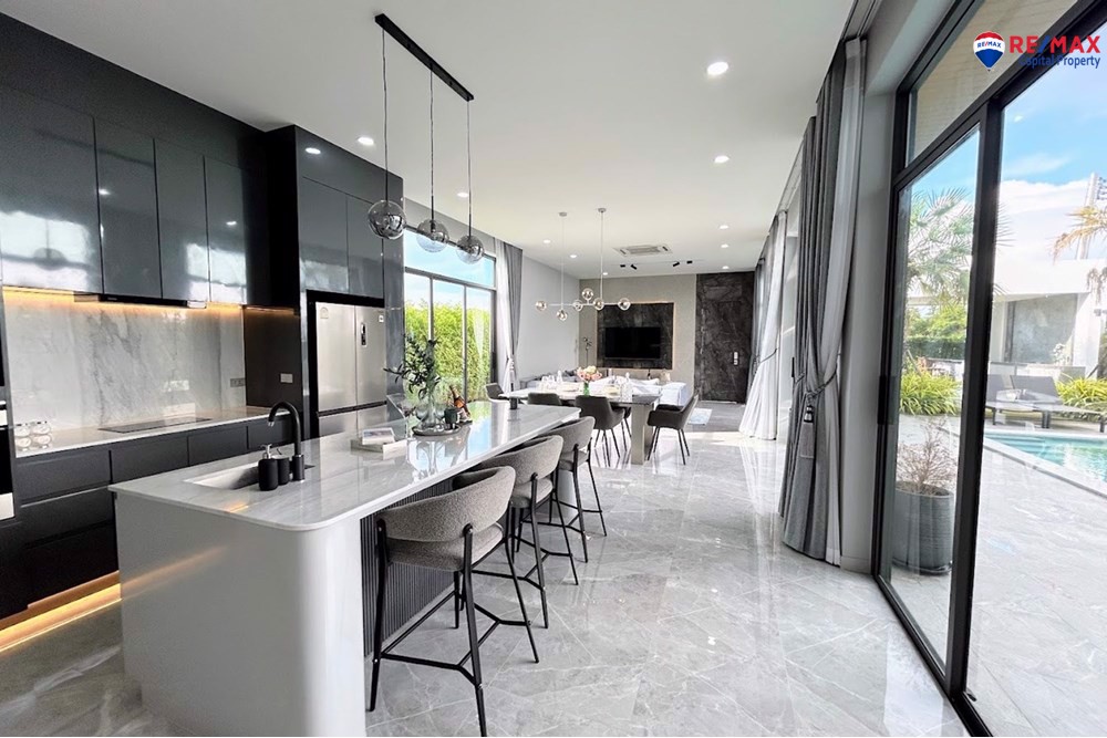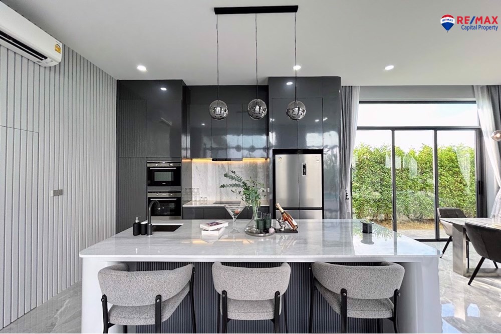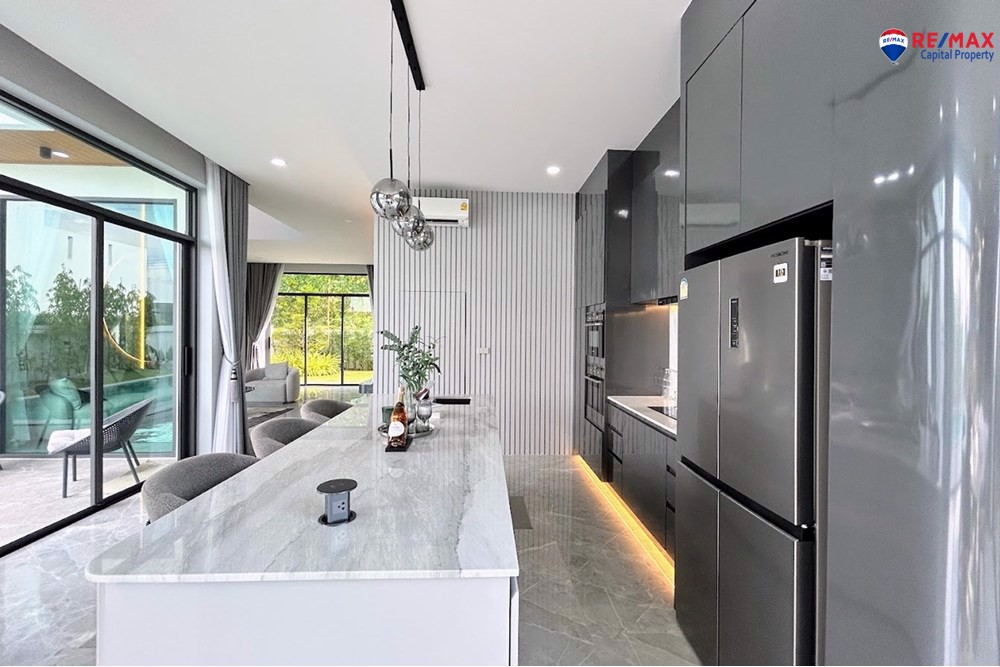 Inside, youll find 4 spacious bedrooms and 5 bathrooms, a large living room with minibar, dining area, and a double-volume lounge. The European kitchen with island and a separate Thai kitchen are fully equipped with premium appliances.