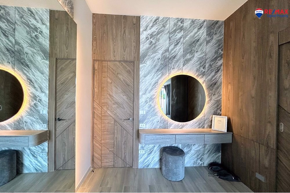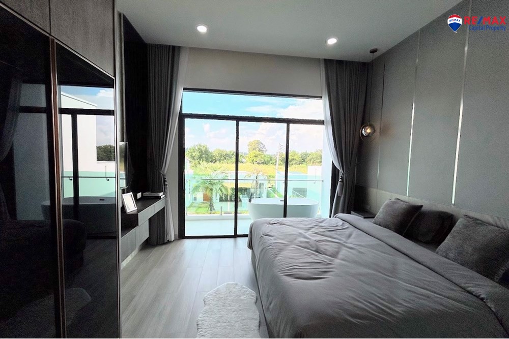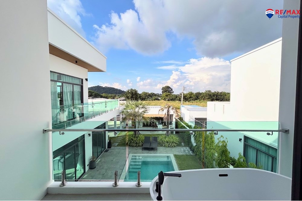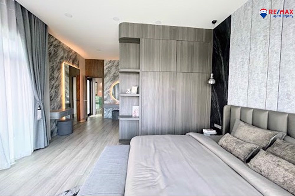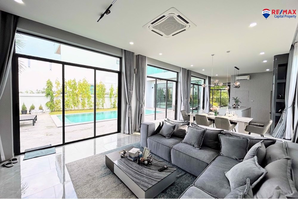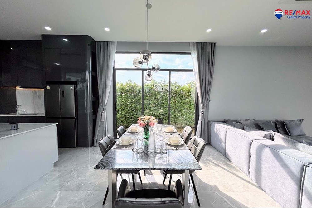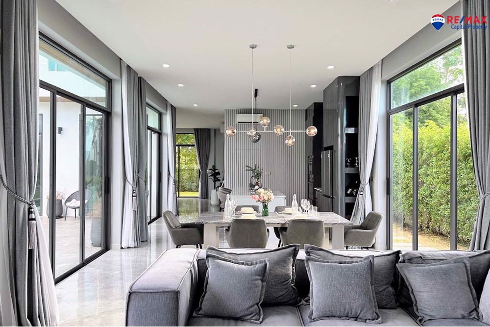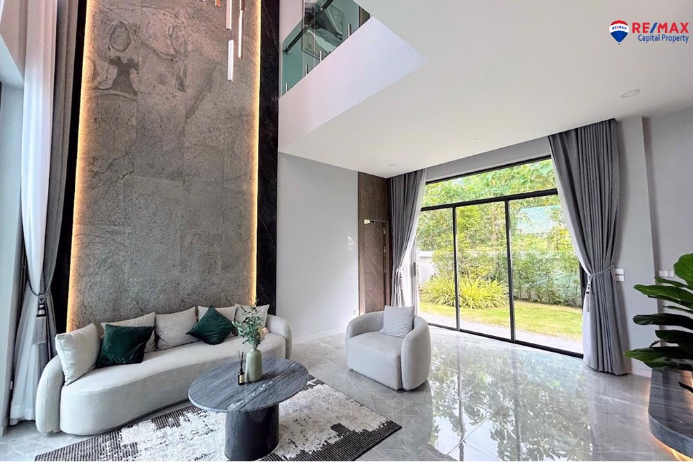 Inside, youll find 4 spacious bedrooms and 5 bathrooms, a large living room with minibar, dining area, and a double-volume lounge. The European kitchen with island and a separate Thai kitchen are fully equipped with premium appliances.