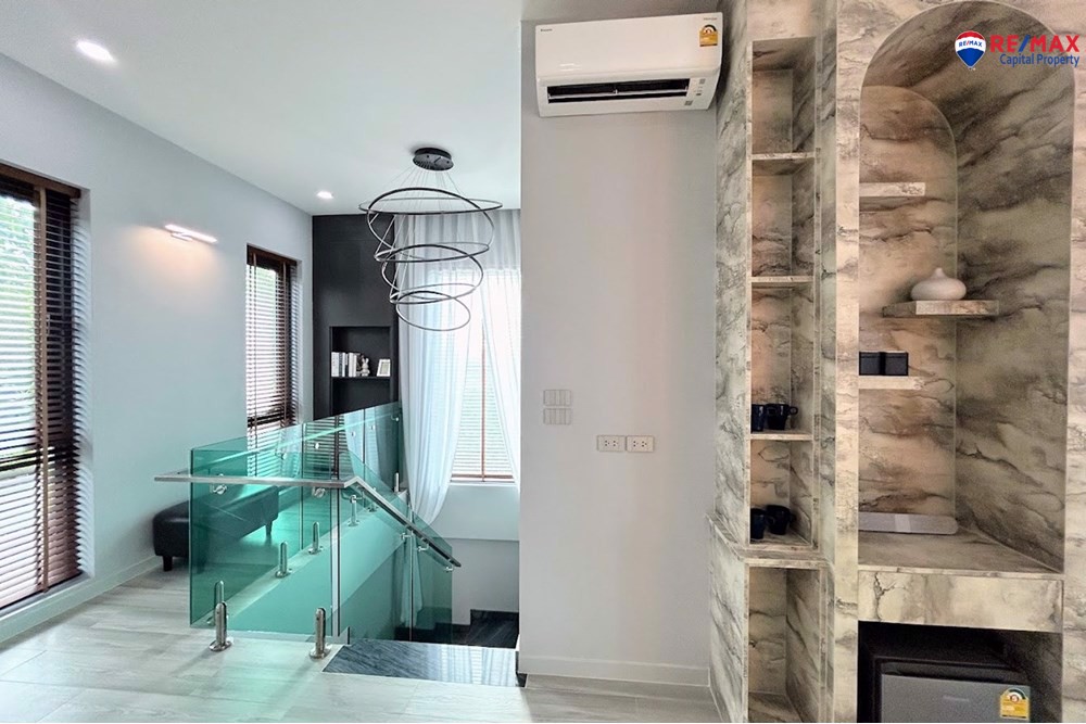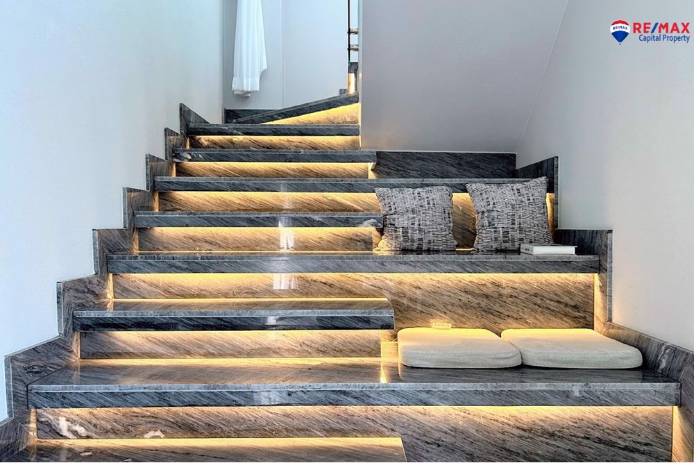 Fully furnished with custom-built furniture, luxury décor, and top-quality materials, veneer stone wall décor, stainless steel and glass railings, and beautiful lighting.