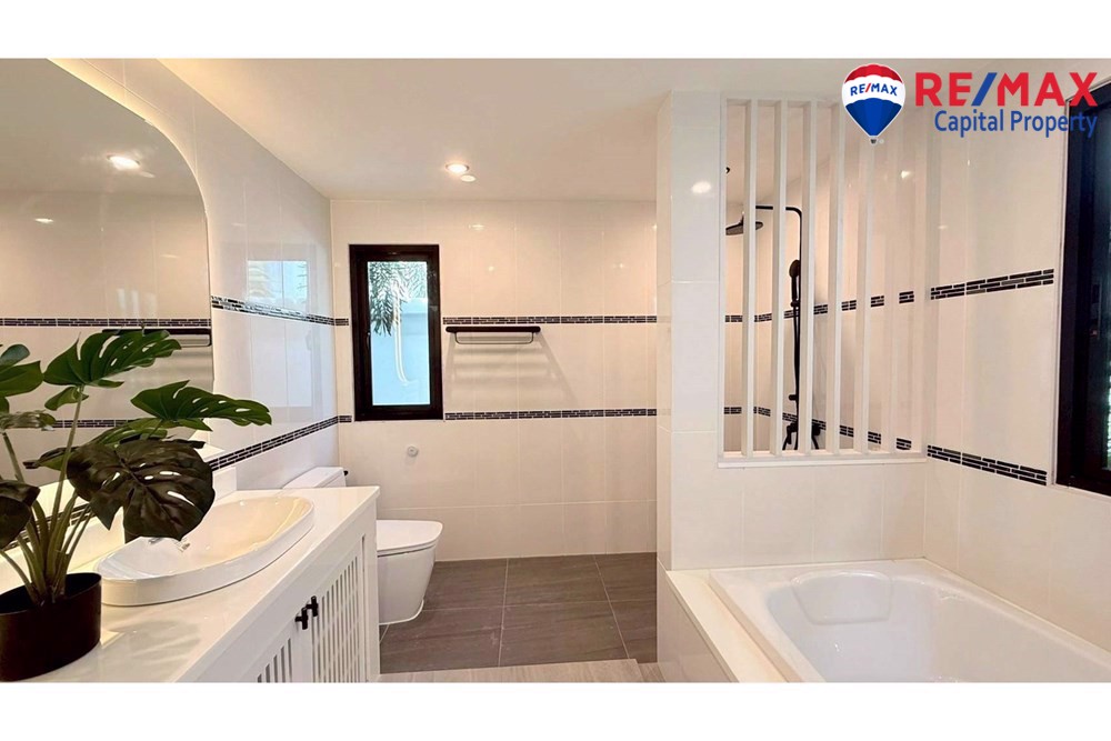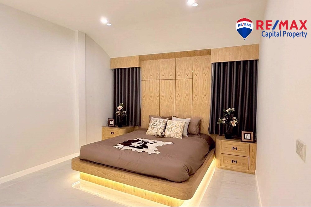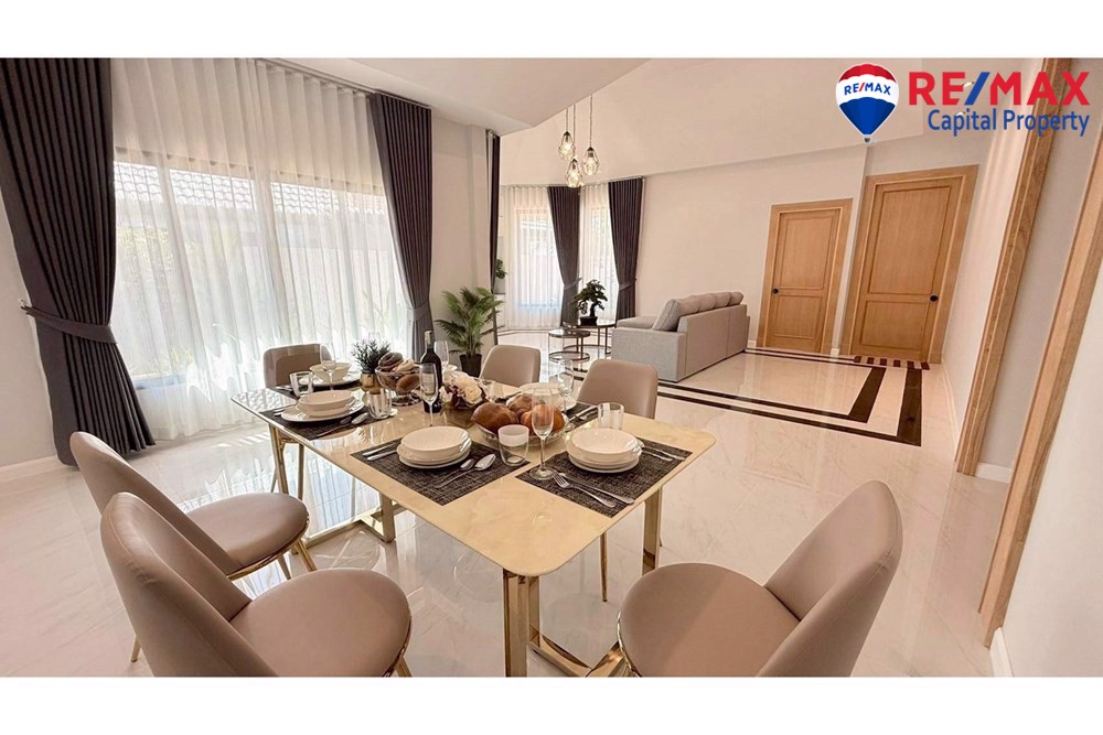 Each house has luxurious traditional Thai teak wood elements, including cabinets and wardrobes, as well as a European-style kitchen installed. The spacious living room has an open-plan design with high vaulted ceilings, making the house cool and comfortable and decorated with beautiful furniture. Beautiful work, good work, Modern & Classic style.
