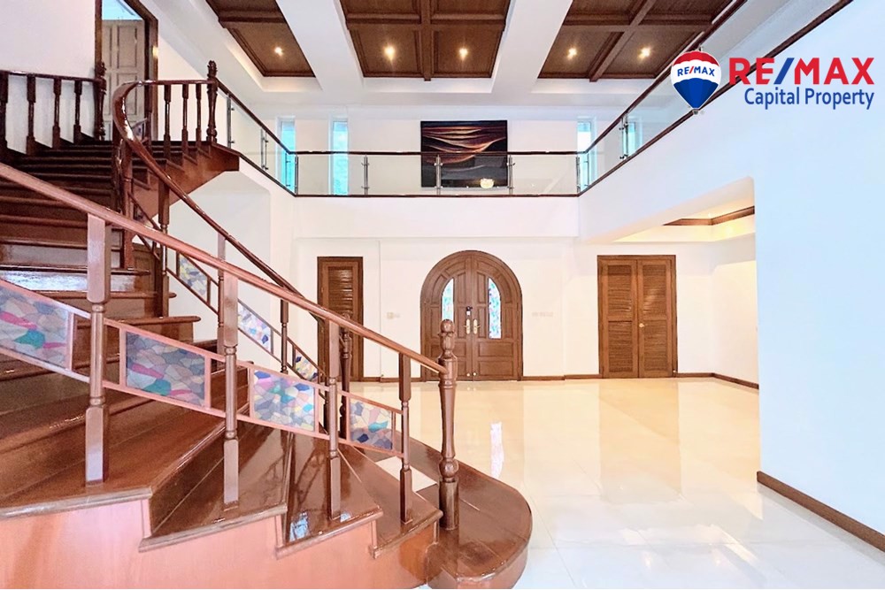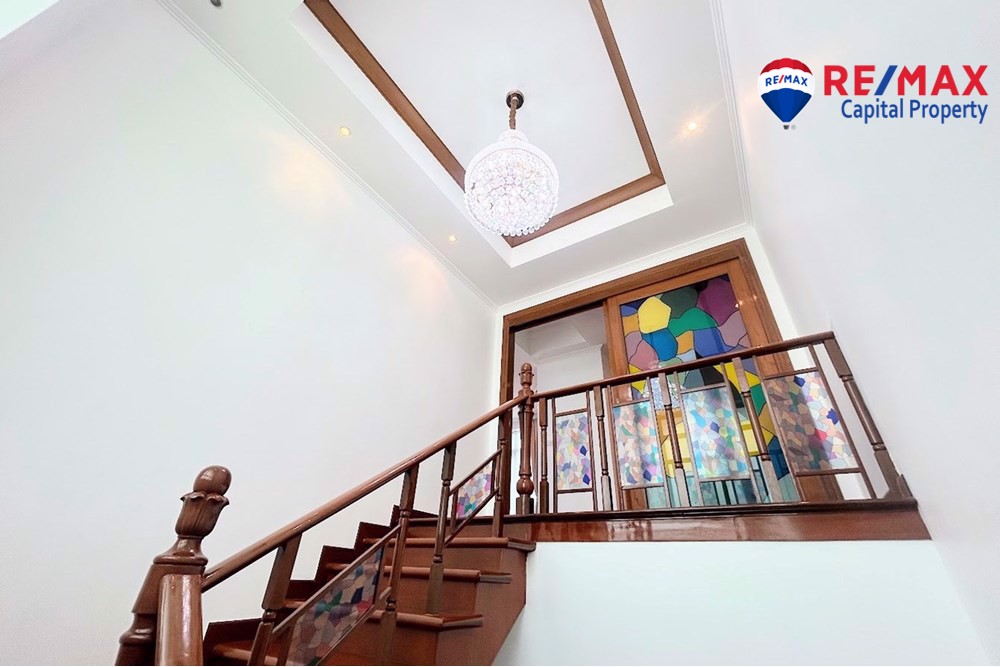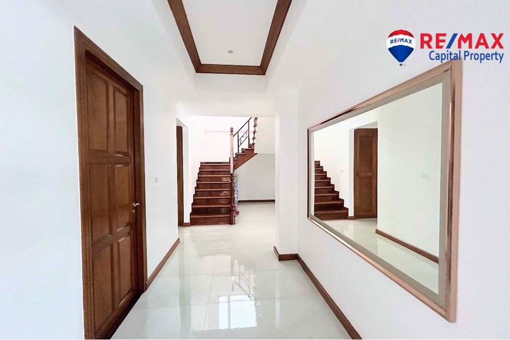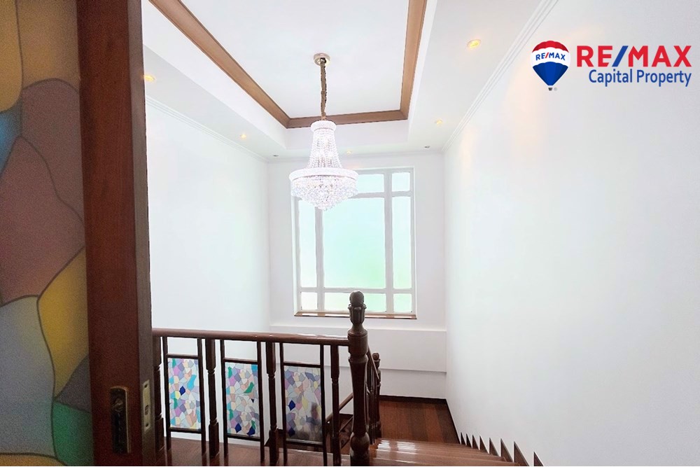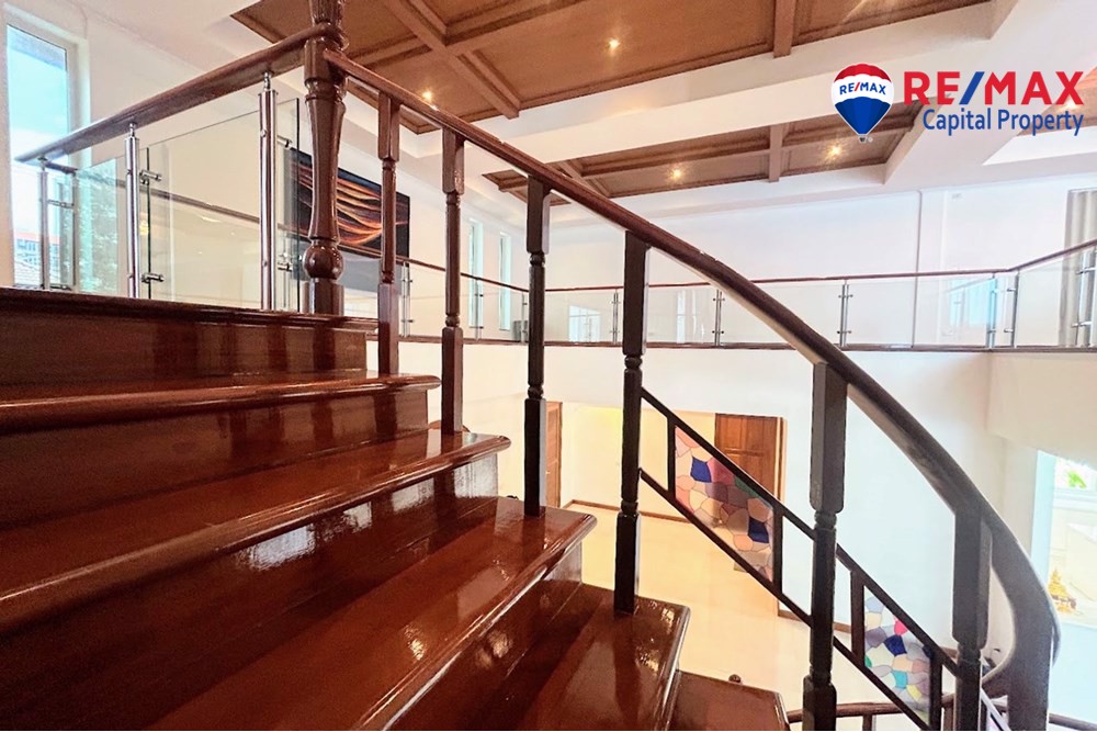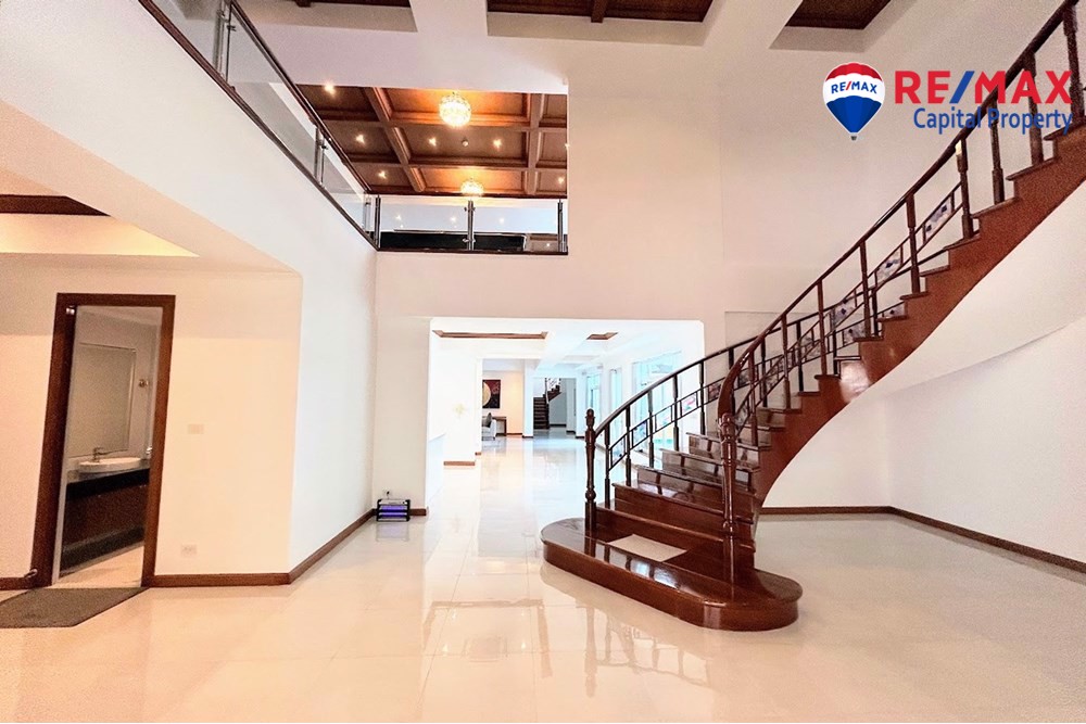 The villa features a large swimming pool with sala and terrace, perfect for relaxing outdoors. Inside, you will find a beautiful living room with high ceiling, a large elegant kitchen, and a grand entrance with an impressive staircase. There are 5 spacious bedrooms with en suite bathrooms 3 bedrooms on the main floor, 1 bedroom upstairs, and a large master suite with walk-in closet and big bathroom.