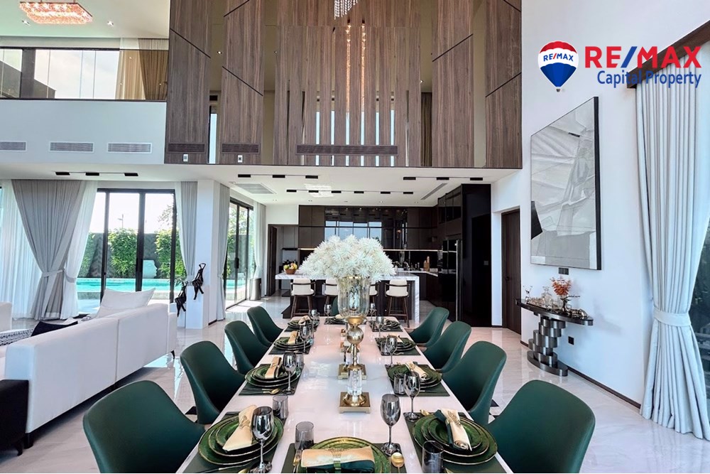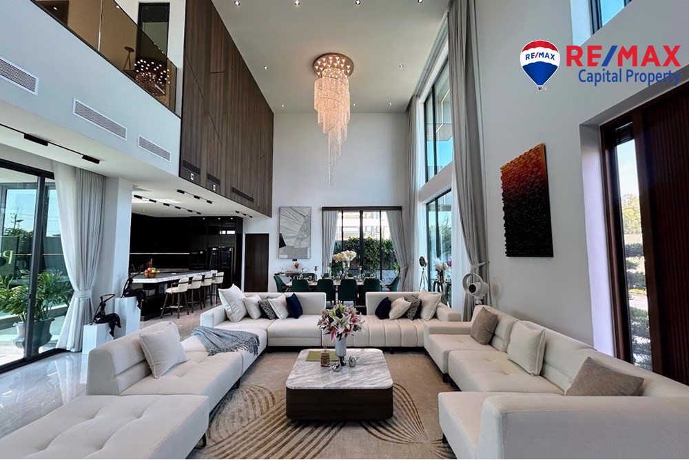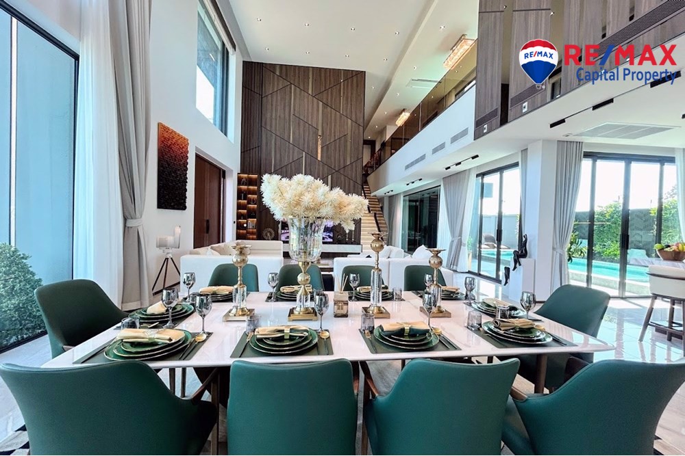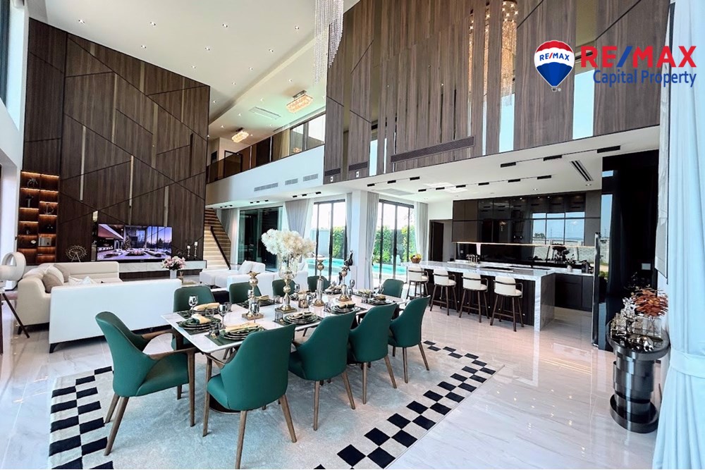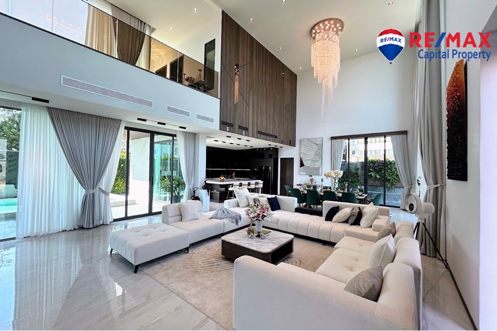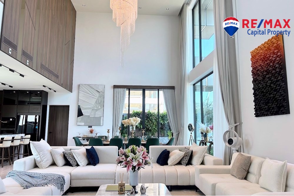 Built on 825.35 sqm of land with 568 sqm living area, the villa features 5 bedrooms (1 downstairs), 6 bathrooms, and a maids room with bathroom. The stunning 7-meter high ceiling and open-plan layout create a bright and spacious atmosphere throughout the home.